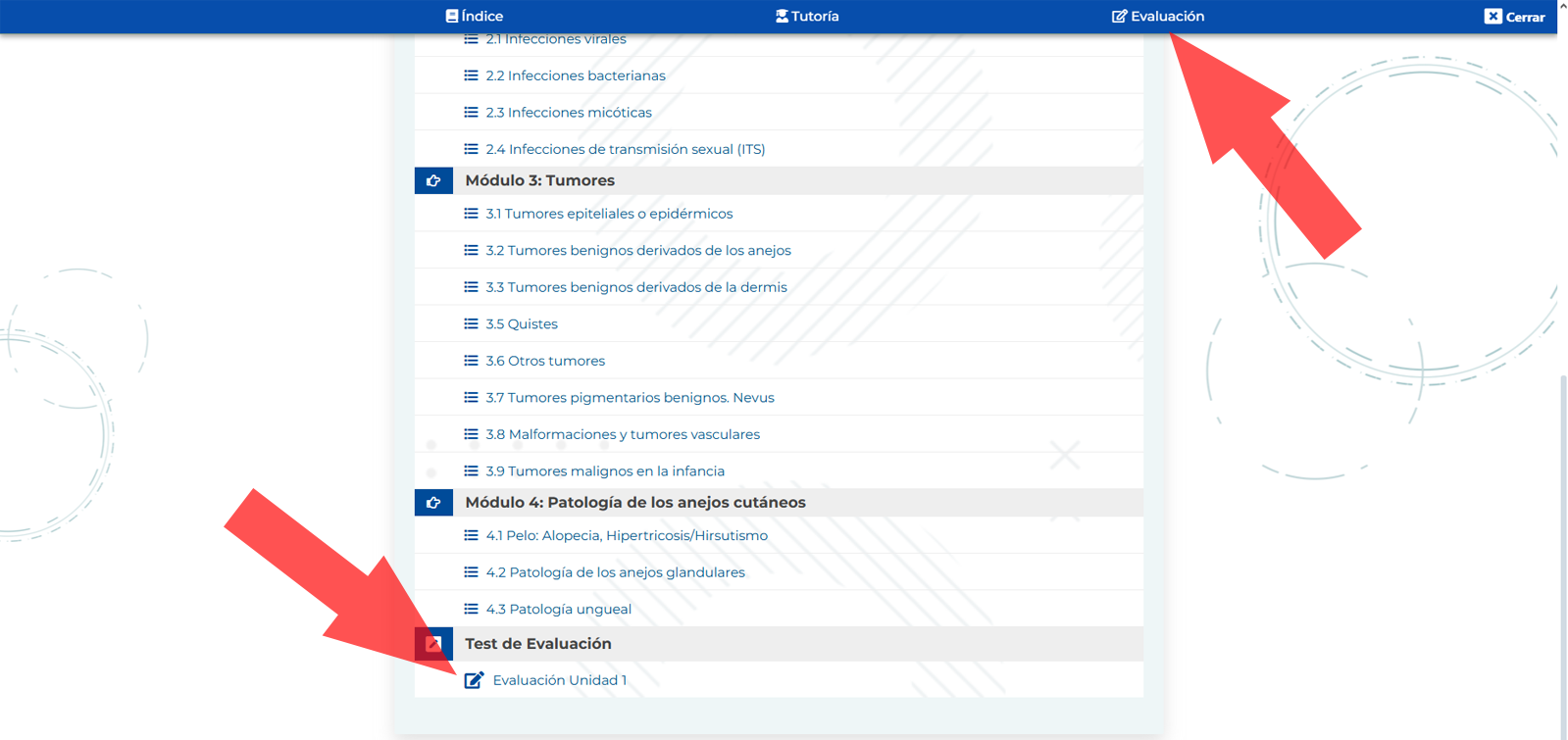 Para realizar la evaluación de una Unidad deberá hacer click en la opción "Evaluación" situada a la derecha del menú de navegación de contenidos del curso. Ver Figura 1.